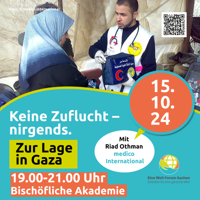 15.10.2024, 19.00 Uhr, Bischöfliche Akademie, Leonhardstraße 18, Aachen: Nach dem Überraschungsangriff der Hamas und anderer bewaffneter palästinensischer Gruppen am 7. Oktober 2023, dem in Israel über 1.000 Menschen zum Opfer fielen, begann das israelische Militär mit den verheerendsten und tödlichsten Angriffen auf Gaza in der Geschichte der seit bald zwei Jahrzehnten abgeriegelten Enklave. Neben mehreren Zehntausend Opfern infolge der militärischen Gewalt und völkerrechtswidriger Angriffe auf zivile Ziele haben die aktive Vorenthaltung von humanitärer Hilfe, die gezielte Zerstörung der Lebensgrundlagen von mehr als zwei Millionen Menschen und zahlreiche Attacken gegen Gesundheitseinrichtungen zu weiteren ungezählten Opfern in Gaza geführt. Die Ernährungslage ist katastrophal, die Gesundheitsversorgung ist kollabiert. Die unterschiedlichen Aspekte dieser rein menschengemachten humanitären Katastrophe lassen sich kaum getrennt voneinander betrachten.