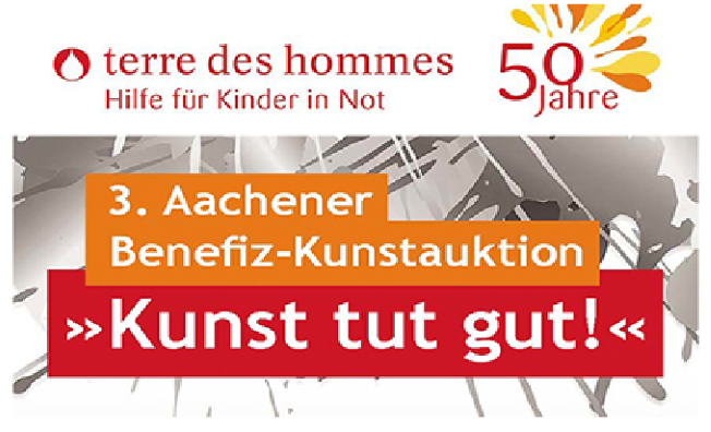 Im Rahmen des 50-jährigen Jubiläums von terre des hommes anlässlich des 50-jährigen Bestehens der Kinderrechtsorganisation lädt die ehrenamtliche Arbeitsgruppe Aachen, alle Kunstinteressierten herzlich ein zur Ausstellung und Auktion von Kunstwerken, die namhafte Künstler aus der Euregio gespendet haben.