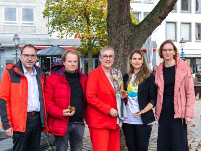 (v. l. n. r.) Beigeordneter für Klima und Umwelt, Stadtbetrieb und Gebäude Heiko Thomas, Teamleiter Baumkontrolle beim Stadtbetrieb Maurice Vonhoegen, Oberbürgermeisterin Sibylle Keupen, Projektleit…
