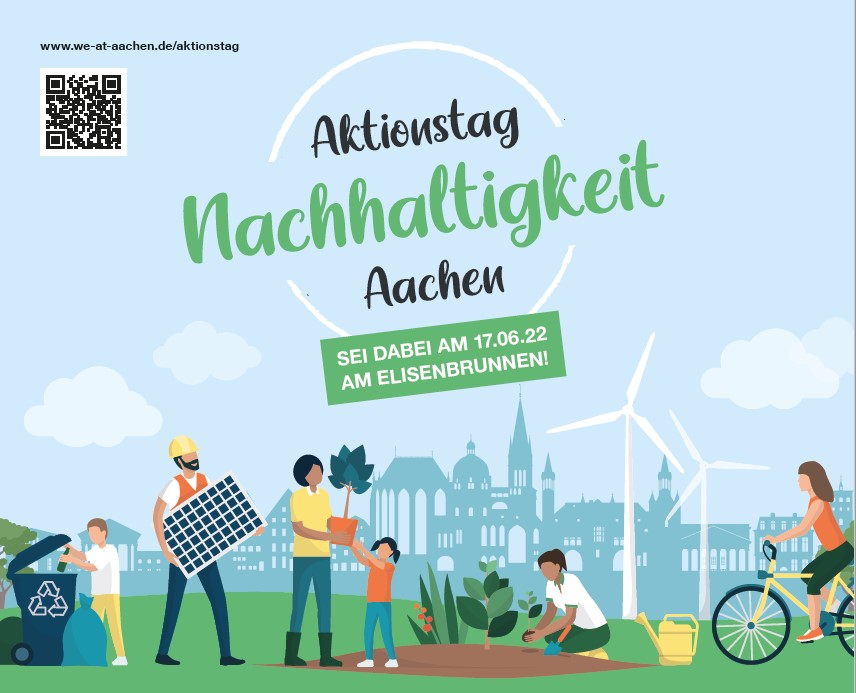 Unter dem Motto „Wir in Aachen – Gemeinsam auf dem Weg“ findet in diesem Jahr der 1. Aachener Aktionstag Nachhaltigkeit statt. Am Freitag, den 17. Juni 2022 von 12:00 – 18:00 Uhr, lädt ein vielfältiges Programm rund um den Elisenbrunnen und entlang der Hartmannstraße zum Mitmachen und zum Austausch ein.