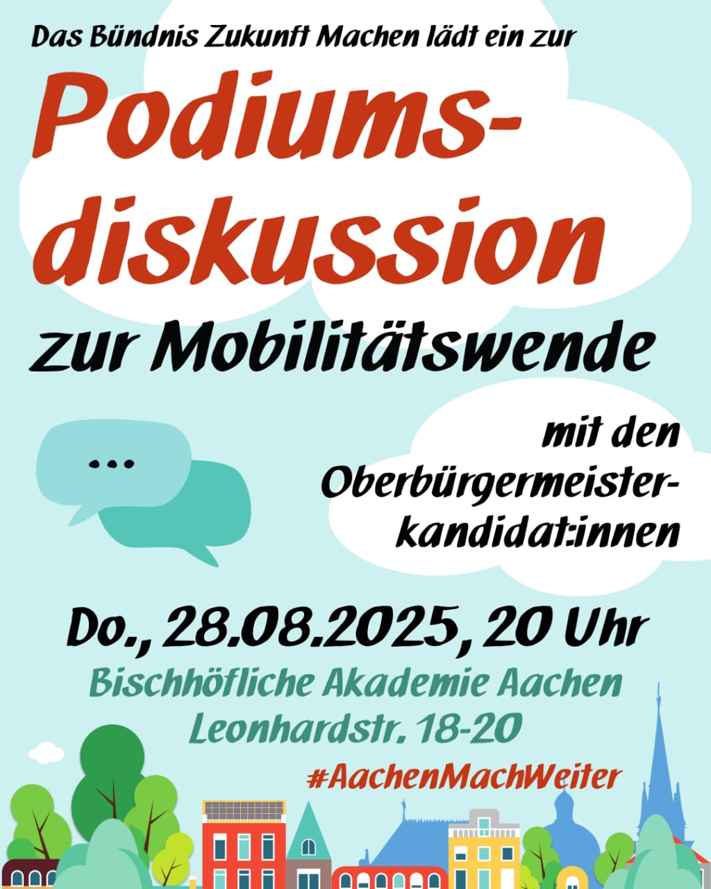 Im Mittelpunkt steht die Frage, wie die dringend notwendige Mobilitätswende in Aachen sozial gerecht, klimafreundlich und zukunftsweisend gestaltet werden kann. Die Oberbürgermeisterkandidat:innen stellen sich den Fragen der Veranstalter – und des Publikums.