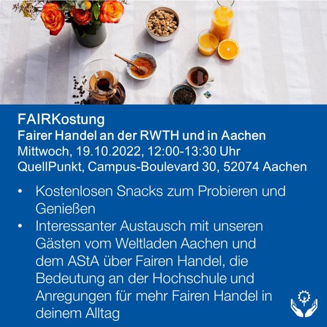 Die Fairtrade-Gruppen der RWTH Aachen und FH Aachen, das Eine Welt Forum Aachen der QuellPunkt und die RWTH Campus GmbH laden herzlich ein!