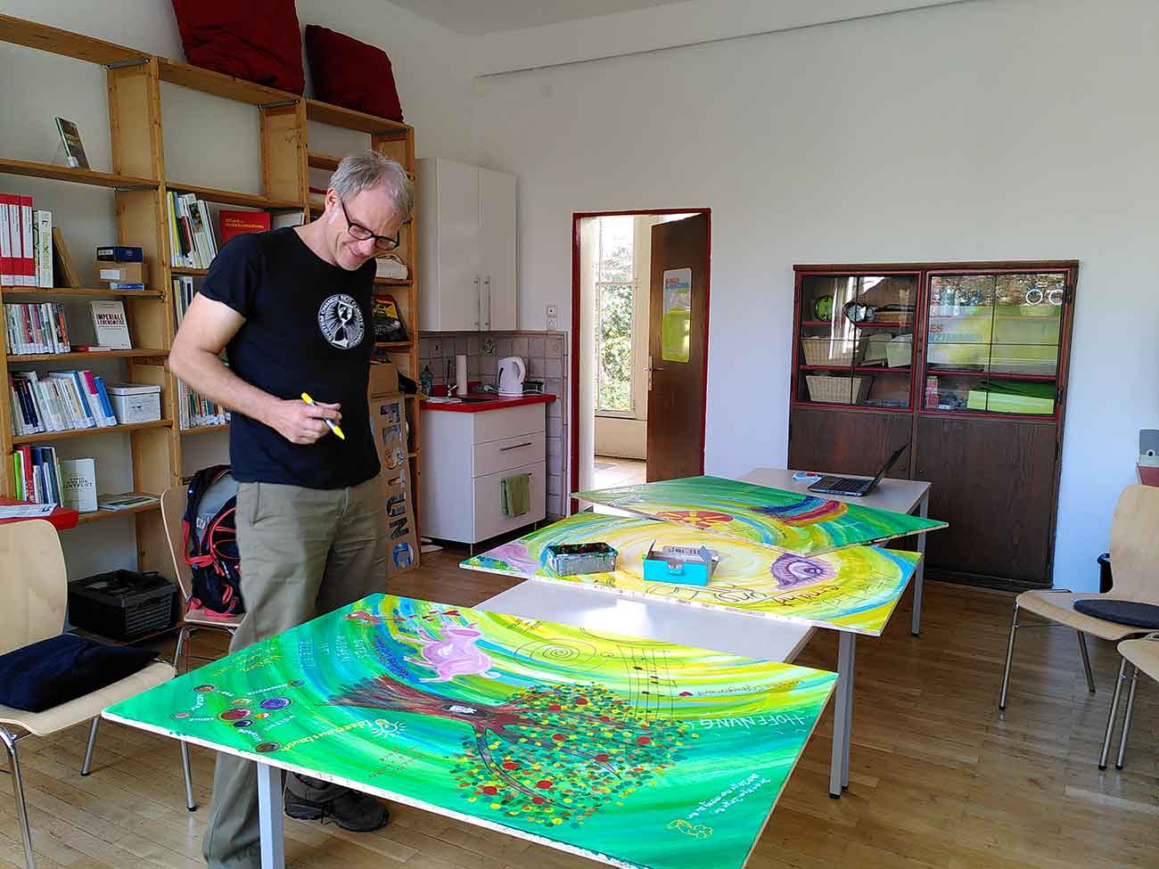 Aufgrund der Corona-Maßnahmen musste die Nachaltigkeitsveranstaltung als Hybrid-Format durchgeführt werden. Die über 100 Teilnehmer am digitalen Format konnten sich über eine interaktive Fläche (https://padlet.com/mgenzsch/kggq45vnbwxgonok) von Zuhause in das Kunstwerk mit einbringen. Am zweiten Tag haben die TeilnehmerInnen im Rahmen der Präsenzveranstaltung im Welthaus direkt vor Ort am Kunstprojekt mitgewirkt. Heute Nachmittag habe ich mich mit Sebastian getroffen um liebevoll und kreativ die Inhalte aus der digitalen Kunstfläche auf das „echte“ Bild zu übertragen.