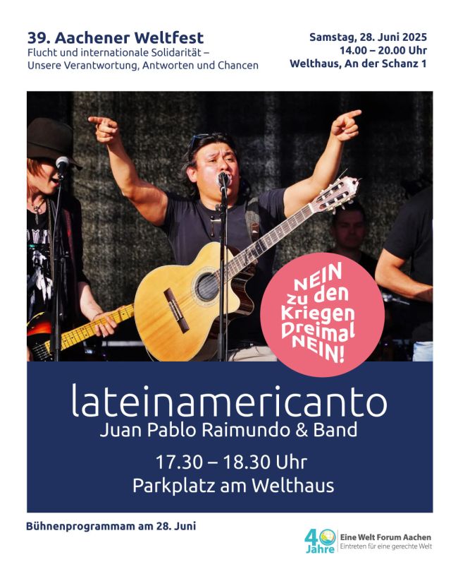 28. Juni, 17.30 Uhr im elthaus Aachen–>Die Aachener Band lateinamericanto bringt einen musikalischen Mix von verschieden Komponisten und Interpreten Lateinamerikas auf die Bühne. Begleiten werden die Songs von unterschiedlichen Musikrichtungen wie Latin, Ballade, Pop, Reggae und Ska, u.a. Komplementiert wird das Repertoire der Band von eigenen Songs des Frontsängers der Band, Juan Pablo Raimundo, der in seinen Lieder auf Spanisch über seine Heimat El Salvador und globale politische Themen schriebt. „Nein zu den Kriegen“, bleibt eine der Hauptaussagen. Dreimal Nein.