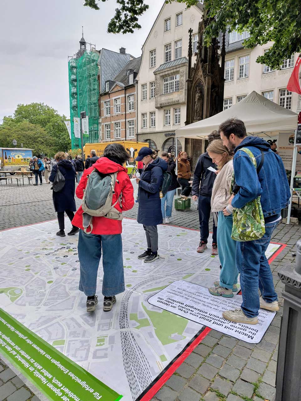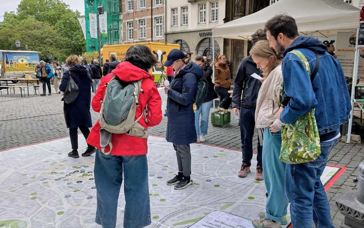 Die Stadt Aachen beteiligte sich im Rahmen des Festivals mit einer besonderen Aktion: Auf einer vier mal fünf Meter großen begehbaren Innenstadtkarte konnten Menschen markieren, wo sie sich mehr Grün wünschen und wo konkret „abgepflastert“ werden soll. Zum Mitmachen eingeladen hatte das städtische Projekt „Innenstadtmorgen“, das sich intensiv mit der Frage beschäftigt, wie Bürgerinnen und Bürger selbst aktiv werden können, um die Aachener Innenstadt gemeinschaftlich zu entwickeln und zu beleben.