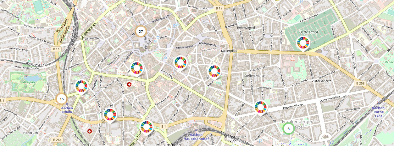 Die Online-Übersicht kann unter www.we-at-aachen.de/initiativen aufgerufen werden. Hier finden sich alle Initiativen,die (Stand heute) Kontaktdaten, Beschreibungstext sowie eine Zuordnung zu den 17 Nachhaltigkeitszielen (SDGs) zur Verfügung gestellt haben. Die user-freundliche Oberfläche erlaubt es den NutzerInnen, nach SDGs, nach Arbeitsschwerpunkten sowie nach Schlagworten zu suchen. Auch werden alle Initiativen mit einer festen postalischen Anschrift auf einer digitalen Stadtkarte angezeigt.