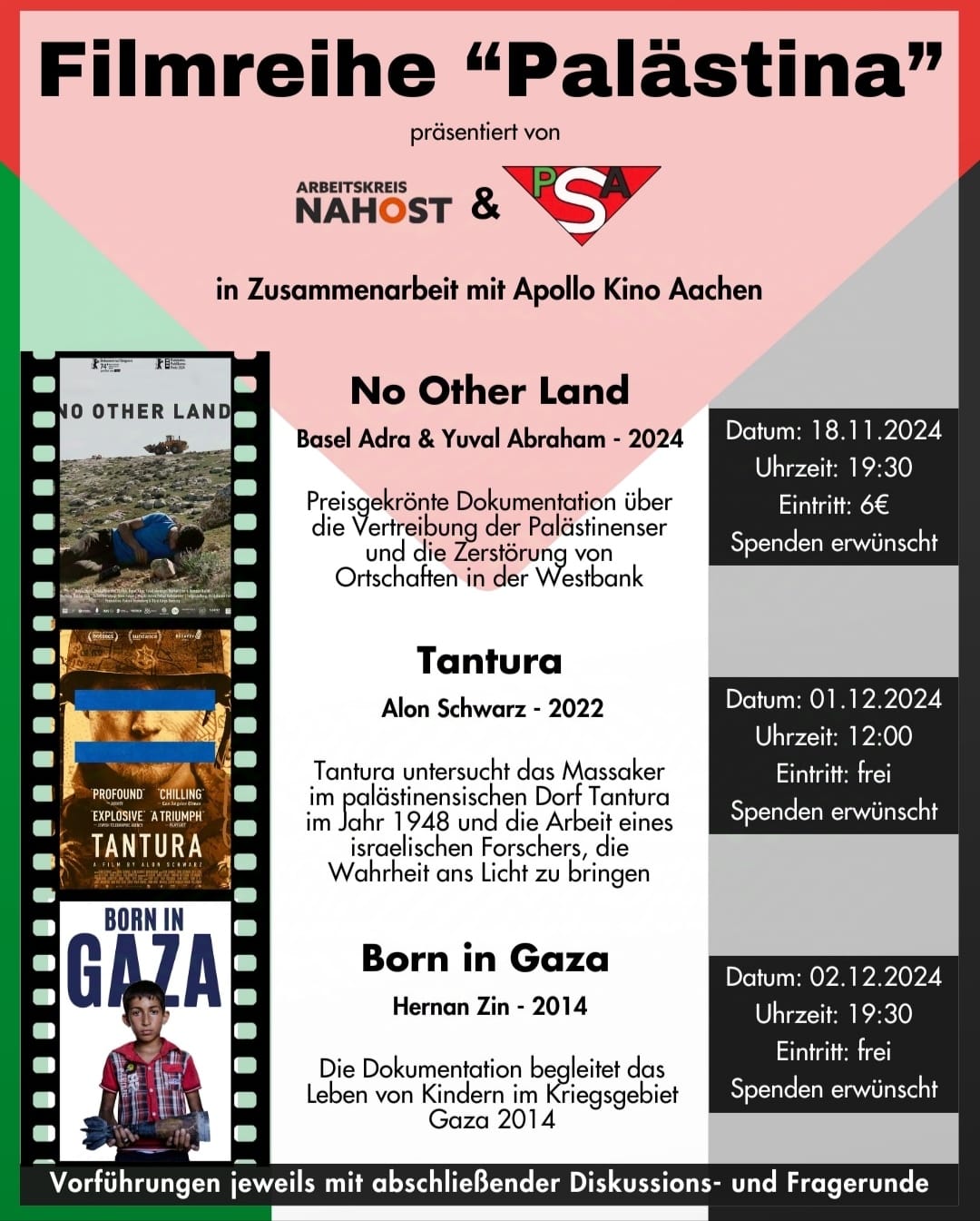 Irritiert haben wir die aktuelle, in der Öffentlichkeit ausgetragene Diskussion um die abgesagte Filmreihe zur Situation in Palästina wahrgenommen, die in Kooperation mit den Betreibern des Aachener Apollo-Kinos, von unserer Mitgliedsgruppe Arbeitskreis Nahost und der Aachener Palestine Solidarity Alliance organisiert worden ist. Hintergrund der Absage der Filmreihe durch die Kinobetreiber ist das Auftauchen eines Plakates während einer Demonstration für die Einhaltung der Menschenrechte in den palästinensischen Kriegsgebieten. Dieses Plakat zeigt Opfer des Holocausts neben Zivilopfern des aktuellen Krieges in Gaza und stellt somit eine assoziative Gleichstellung zwischen diesen beiden Situationen dar. Das zu Recht kritisierte und mit den Organisatoren der Demonstration nicht abgestimmte Plakat ist aus unserer Sicht nicht nur deplatziert, sondern inakzeptabel. Solche Darstellungen schaden der notwendigen, kritischen Auseinandersetzung mit der Realität in den aktuellen Konflikt-Gebieten und verfälschen zudem die historische Aufarbeitung der antisemitischen Holocaust-Strategien während des Nationalsozialismus.