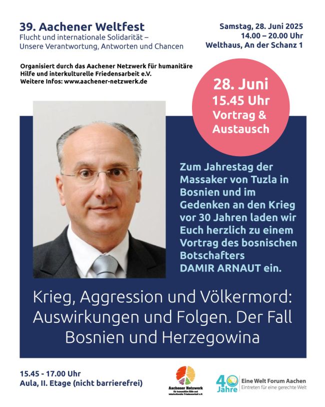 28. Juni, 15.45 Uhr im Welthaus Aachen–> Zum Jahrestag der Massaker von Tuzla in Bosnien und im Gedenken an den Krieg vor 30 Jahren laden wir Sie herzlich zu einem Vortrag des bosnischen Botschafters Damir Arnaut ein. Im Fokus stehen die Migrationsströme aus Bosnien nach Europa der letzten drei Jahrzehnte, ihre Hintergründe und Fluchtursachen sowie die aktuelle Lage. Tauchen Sie ein in eine wichtige Diskussion über die Herausforderungen und Chancen von Migration, die nicht nur Bosnien, sondern ganz Europa, betreffen.