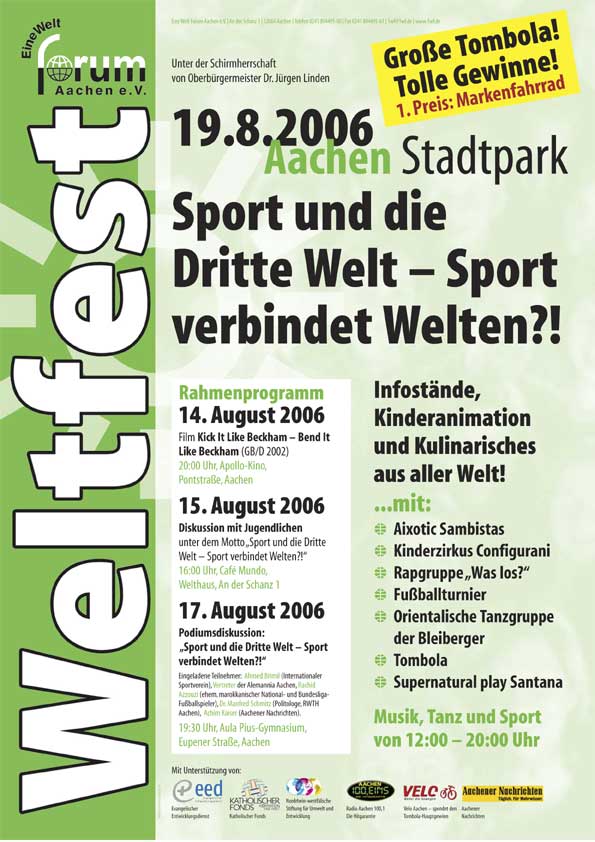 die Weltreiterspiele in Aachen einen euregionalen Bezug herstellen, sondern vor allem die durch die Fußballweltmeisterschaft ausgelöste Begeisterung der Menschen aufgreifen. Auf dem Fest vor allem aber durch die Veranstaltungen unseres Rahmenprogramms während der Eine Welt Woche in der Zeit vom 07. bis 12. 08.2006 möchten wir die vielfältige Bedeutung, die dem Sport national wie auch international zukommen kann, hinterfragen. Sport hat zwei gegensätzliche Seiten: er kann Menschen, auch aus unterschiedlichen Kulturen, zusammenbringen, aber er kann ebenso Missverständnisse und im Extremfall blutige Auseinandersetzungen (mit) hervorrufen. Sport kann also ebenso verbinden, wie er trennen kann.